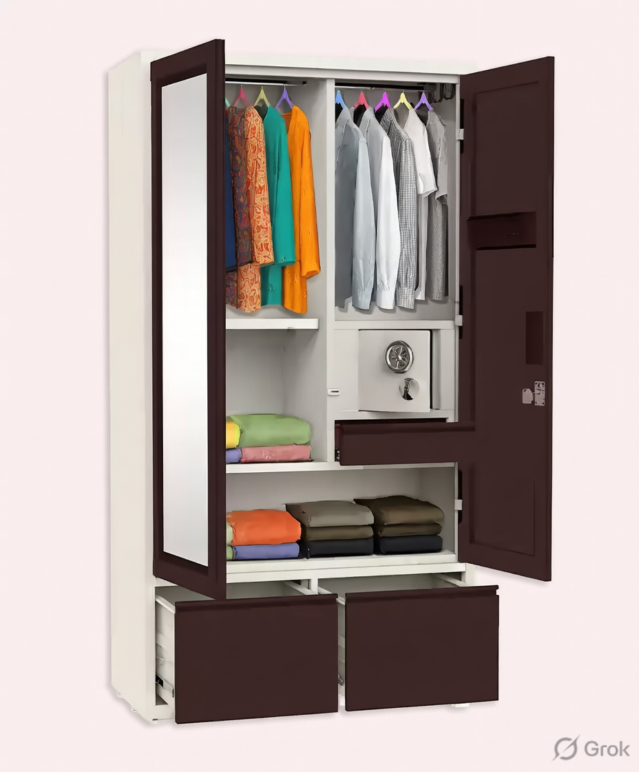 Step into a world where style meets structure. With a secure built‑in safe, spacious drawers, and a playful mix of colourful hangers, it’s more than just storage—it’s a statement.