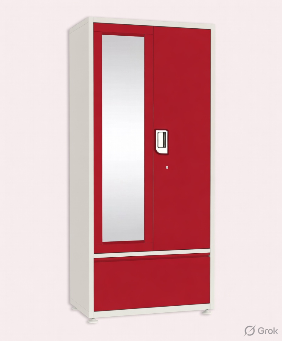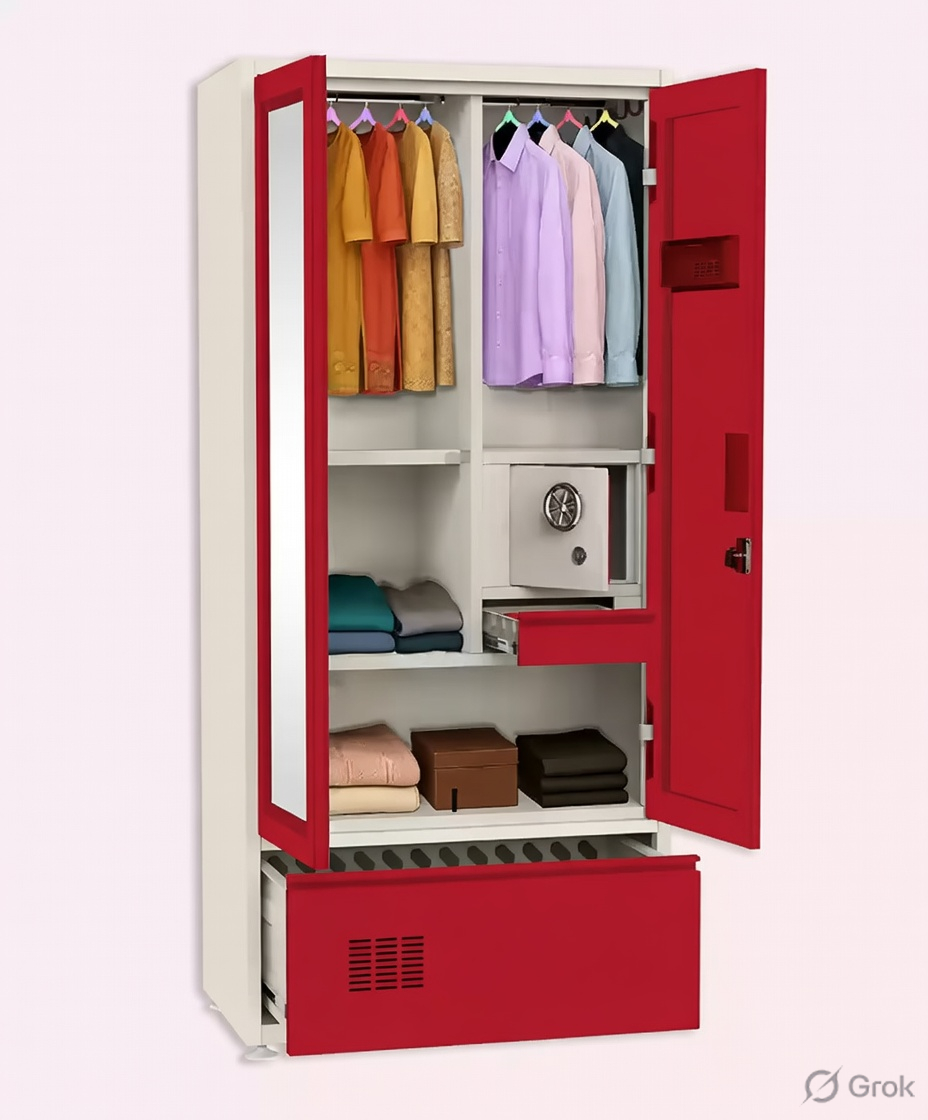 Step into a world where style meets structure. This vibrant maroon and white wardrobe is designed for those who value both aesthetics and functionality. With a secure built-in safe, spacious drawers, and a playful mix of colorful hangers, it’s more than just storage—it’s a statement.